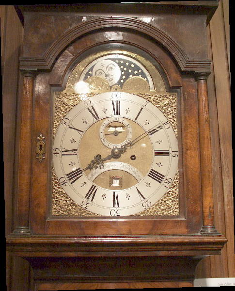 John Calver, Woodbridge c.1735Walnut longcase clock. John Calver was born in 1693 and died in 1751. He is considered to be one of the best clockmakers of his period. This is an early example of a well-executed brass rolling moon dial. Inside the door of the walnut case is an Equational timetable. This is a chart to explain to the owner how to set the clock to time using a sundial. It is exceedingly rare to find such a table in provincial clocks.