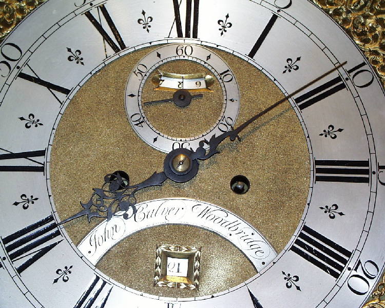 John Calver was born in 1693 and died in 1751. He is considered to be one of the best clockmakers of his period. This is an early example of a well-executed brass rolling moon dial. Inside the door of the walnut case is an Equational timetable. This is a chart to explain to the owner how to set the clock to time using a sundial. It is exceedingly rare to find such a table in provincial clocks.