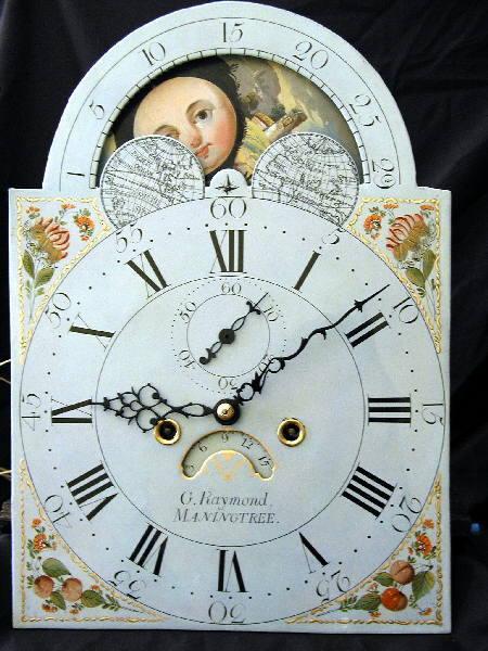 Finely proportioned mahogany case with early painted moon dial. The eight-day striking movement has some unusual features and it may be that Raymond was not a trained clockmaker. The case hood features high side windows.