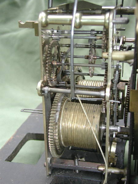 Finely proportioned mahogany case with early painted moon dial. The eight-day striking movement has some unusual features and it may be that Raymond was not a trained clockmaker. The case hood features high side windows.