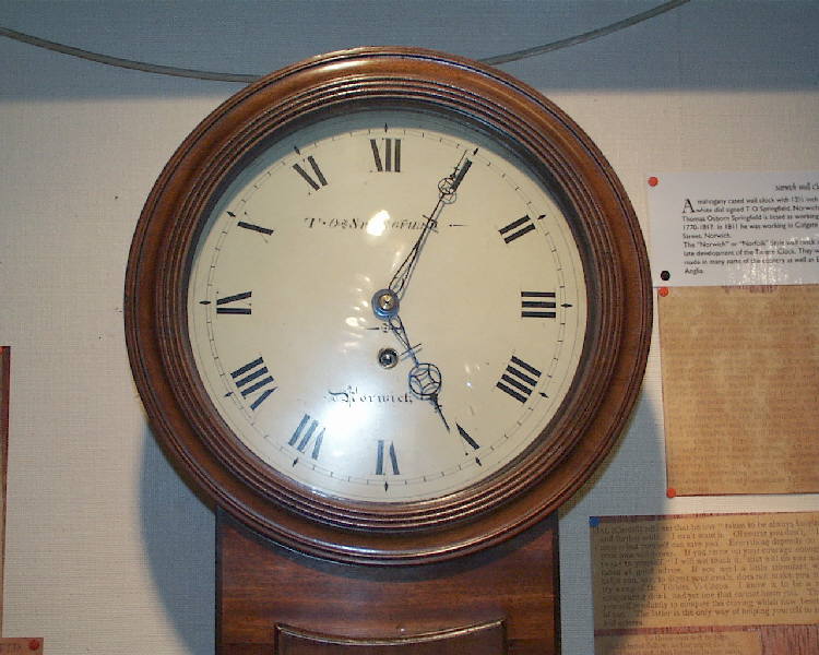 Thomas Osborn Springfield is listed as working 1770-1817. In 1811 he was working in Colgate Street, Norwich. The " Norwich" or " Norfolk" Style wall clock is a late development of the Tavern Clock. They were made in many parts of the country as well as East Anglia.