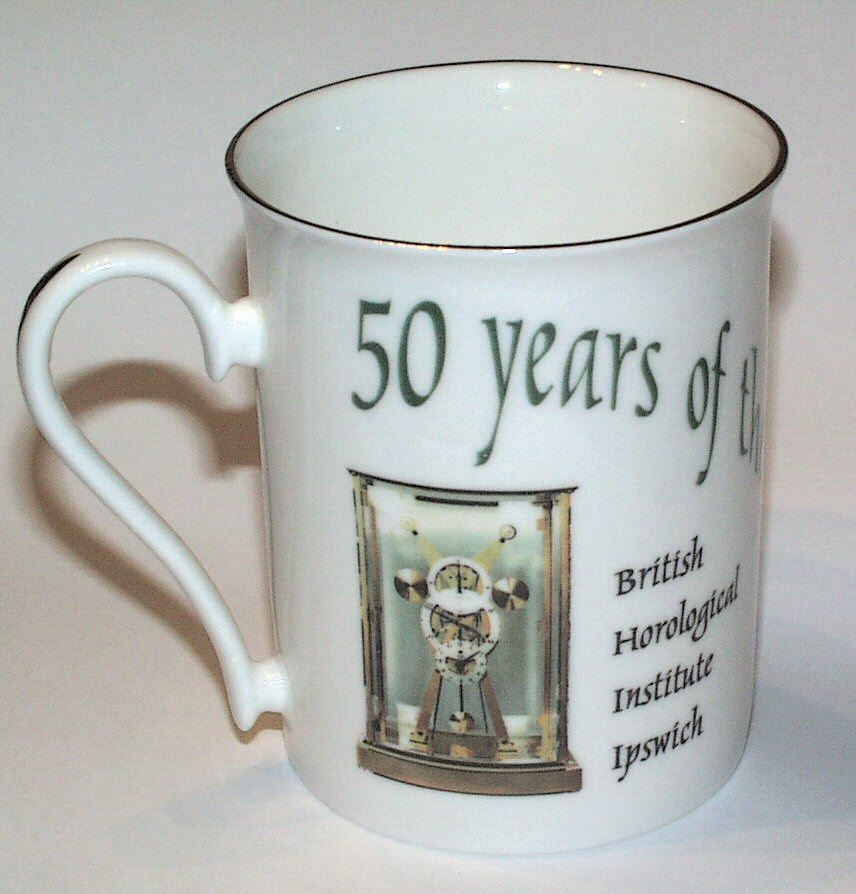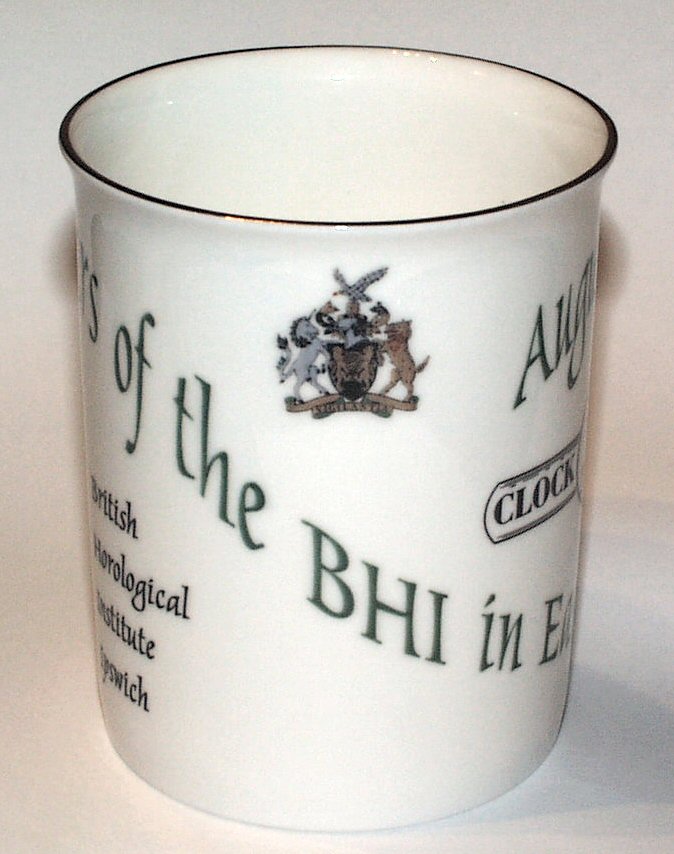 Lowestoft Porcelain made these fine porcelain mugs for us, to our own design incorporating our "Clockwatching" logo, the BHI Armorial bearings, and the BHI Millenium clock.